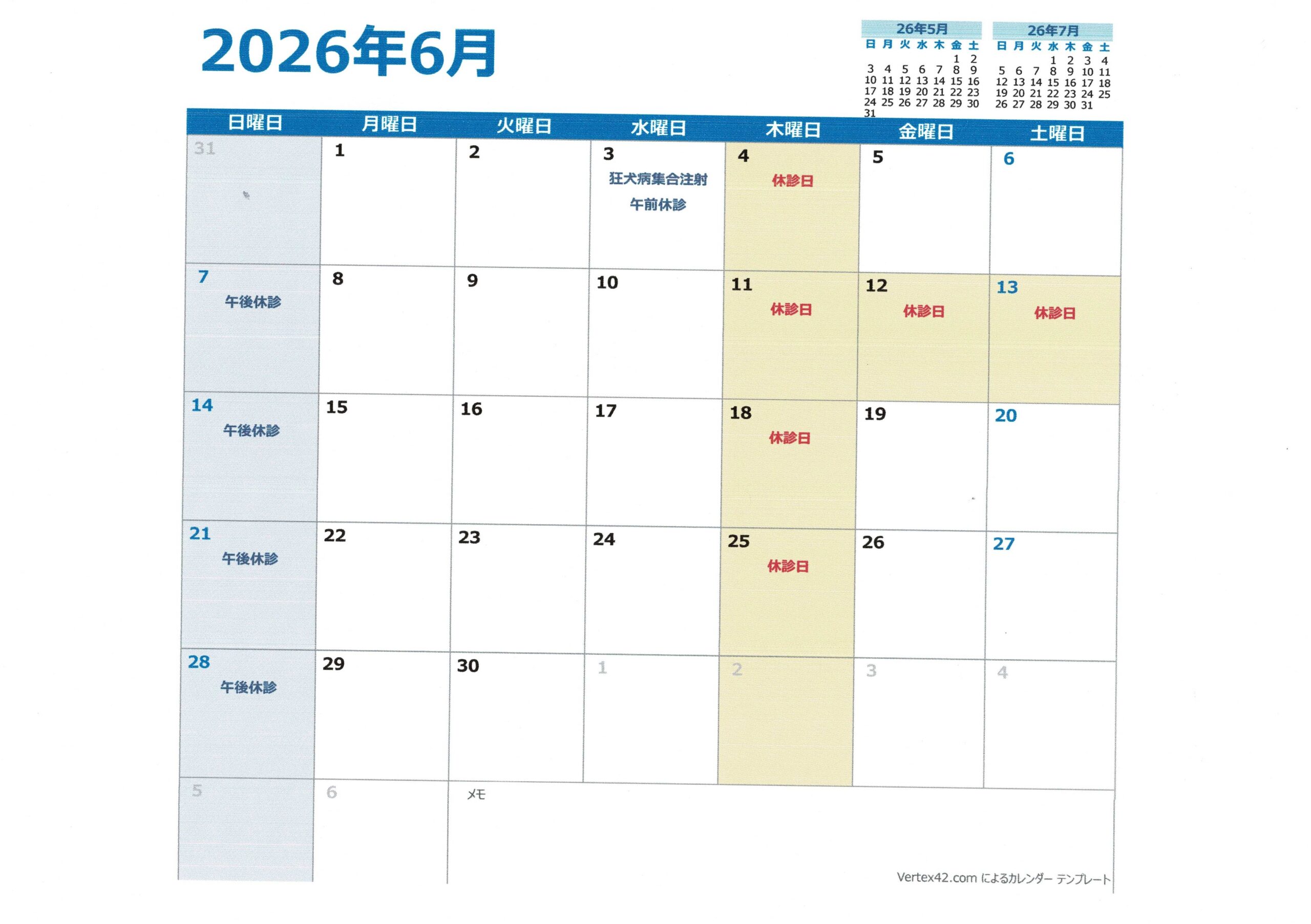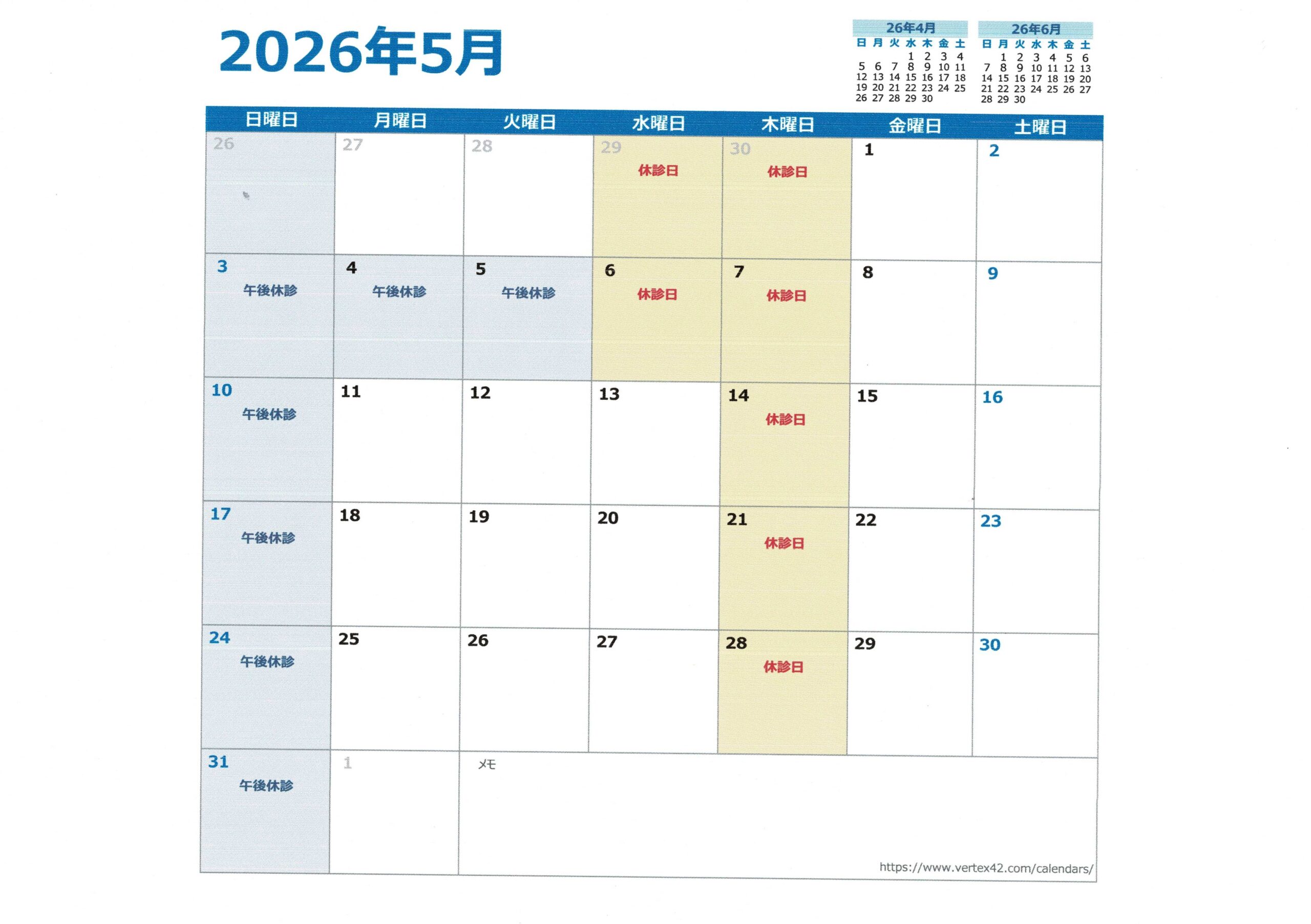 令和8年4月5月6月診察カレンダー